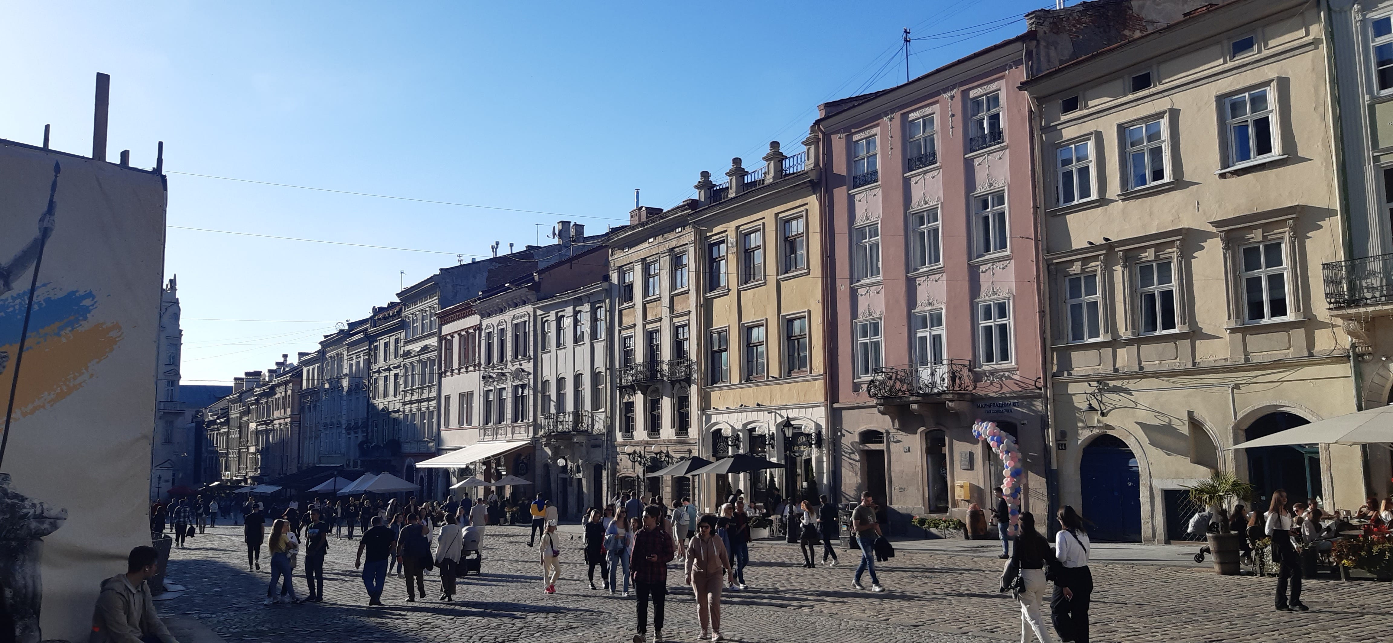 Apart from a few reminders. Closed museums and covered monuments. Stacks of sandbags. Pictures of the fallen and the Azovstal banner hanging on the south wall of City Hall.